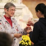 Sister Marilyn Baker offers communion during the 2024 Mass on the Feast Day for Saint Mother Theodore Guerin.