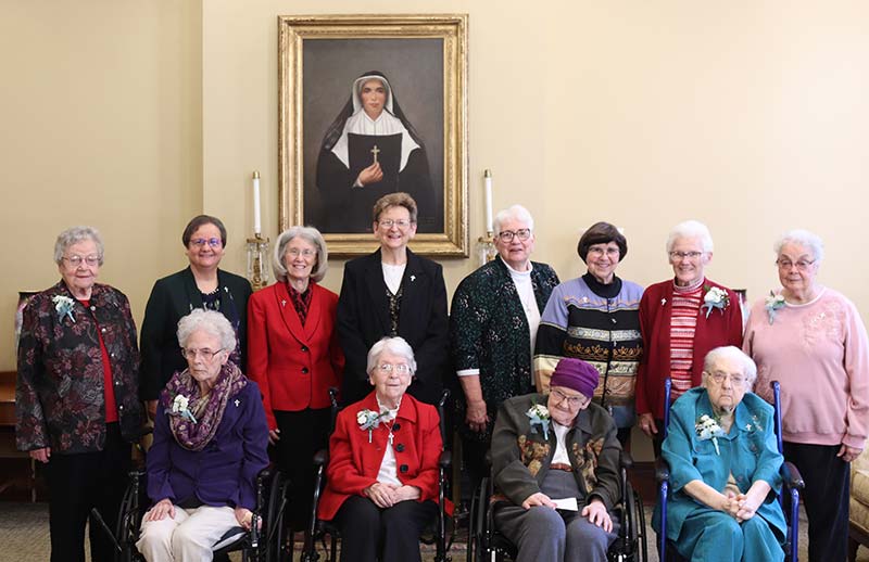 Sister celebrating 70 years with the Congregation this year included (front, from left) Sister Ann-Margaret O’Hara, Sister Margaret Quinlan, Sister Suzanne Dailey and Sister Mary Ann Phelan along with (back, left) Sister Alice Ann Rhinesmith and (back, second from right and far right) Sister Jean Fuqua and Sister Ann Matilda Holloran. They are photographed with (back, second from left) General Councilor Sister Anne Therese Falkenstein, Vicar/General Treasurer Sister Jeanne Hagelskamp, General Superior Sister Dawn Tomaszewski, and General Councilors Sister Laura Parker and Sister Carole Kimes. Not photographed: Sister Josephine Bryan.