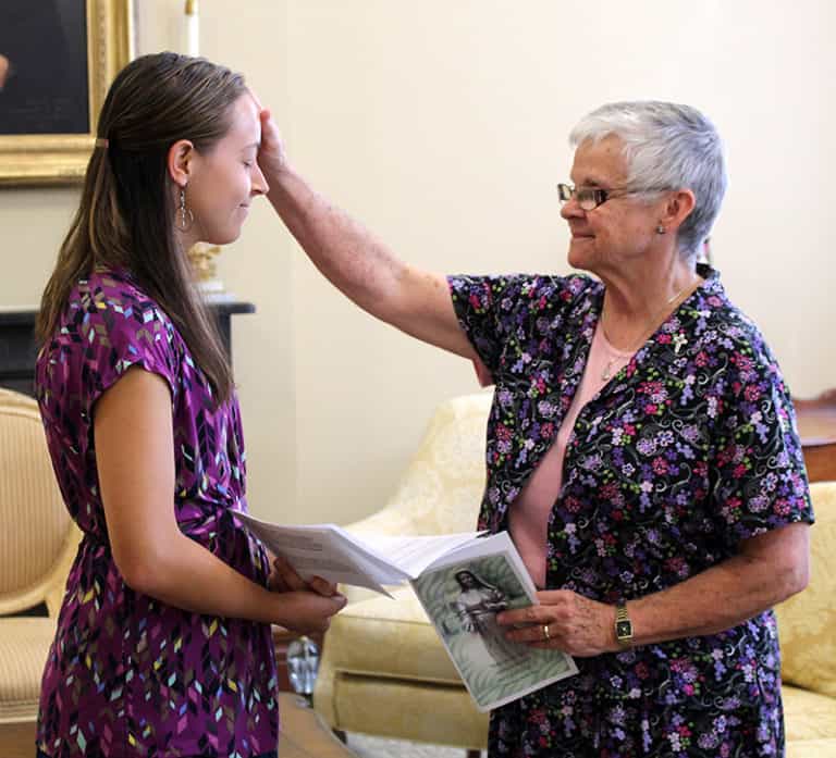 Tracey Horan enters the postulancy of the Sisters of Providence of Saint Mary-of-the-Woods on Sept. 8, 2014. Sisters welcome her with open hearts and arms during a short ritual filled with prayer, readings and song. She receives a special blessing…