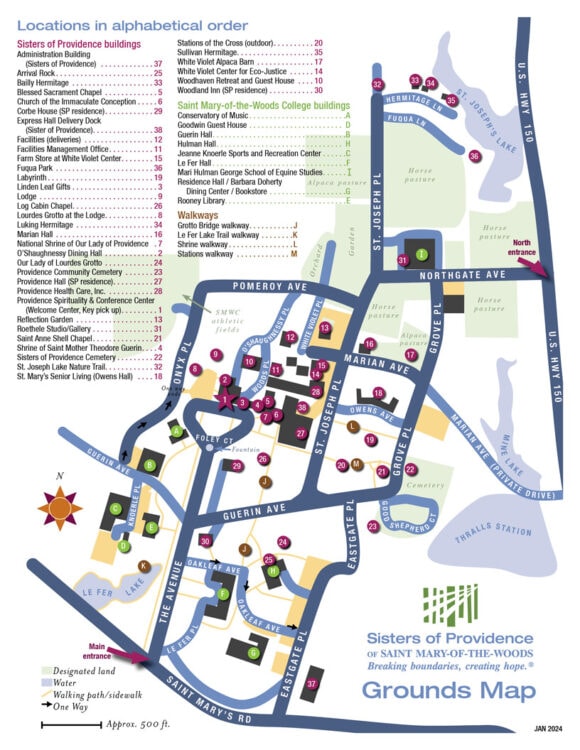All of the above directions take you to the main entrance, which is the point on the map marked “security.” Once you arrive at Saint Mary-of-the-Woods, you’ll need to know where you are heading. This local map should help – you might find it useful to print it. Download a PDF of the map.